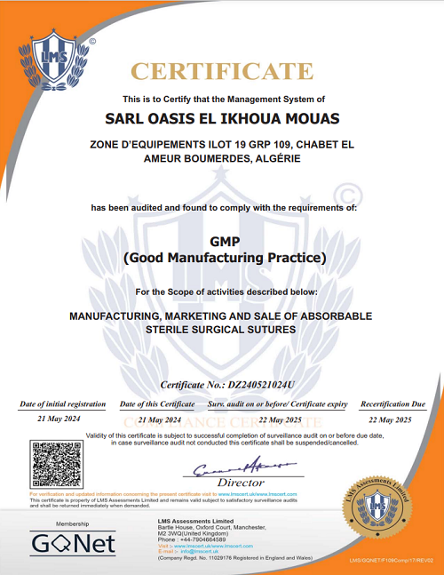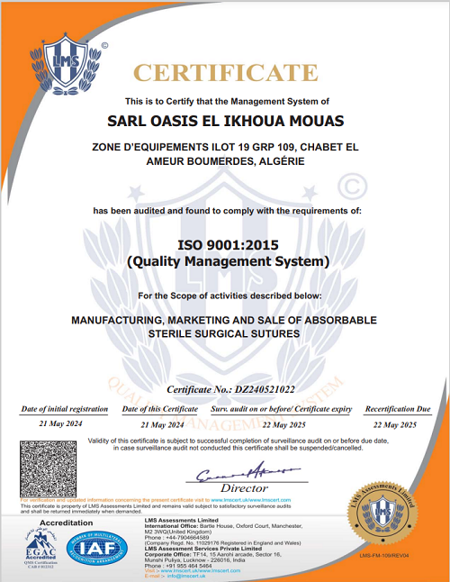 -Conforme aux exigences normes ISO 9001 : 2015 ; ISO 13485 : 2016 & BPF (Bonnes Pratiques de Fabrication)